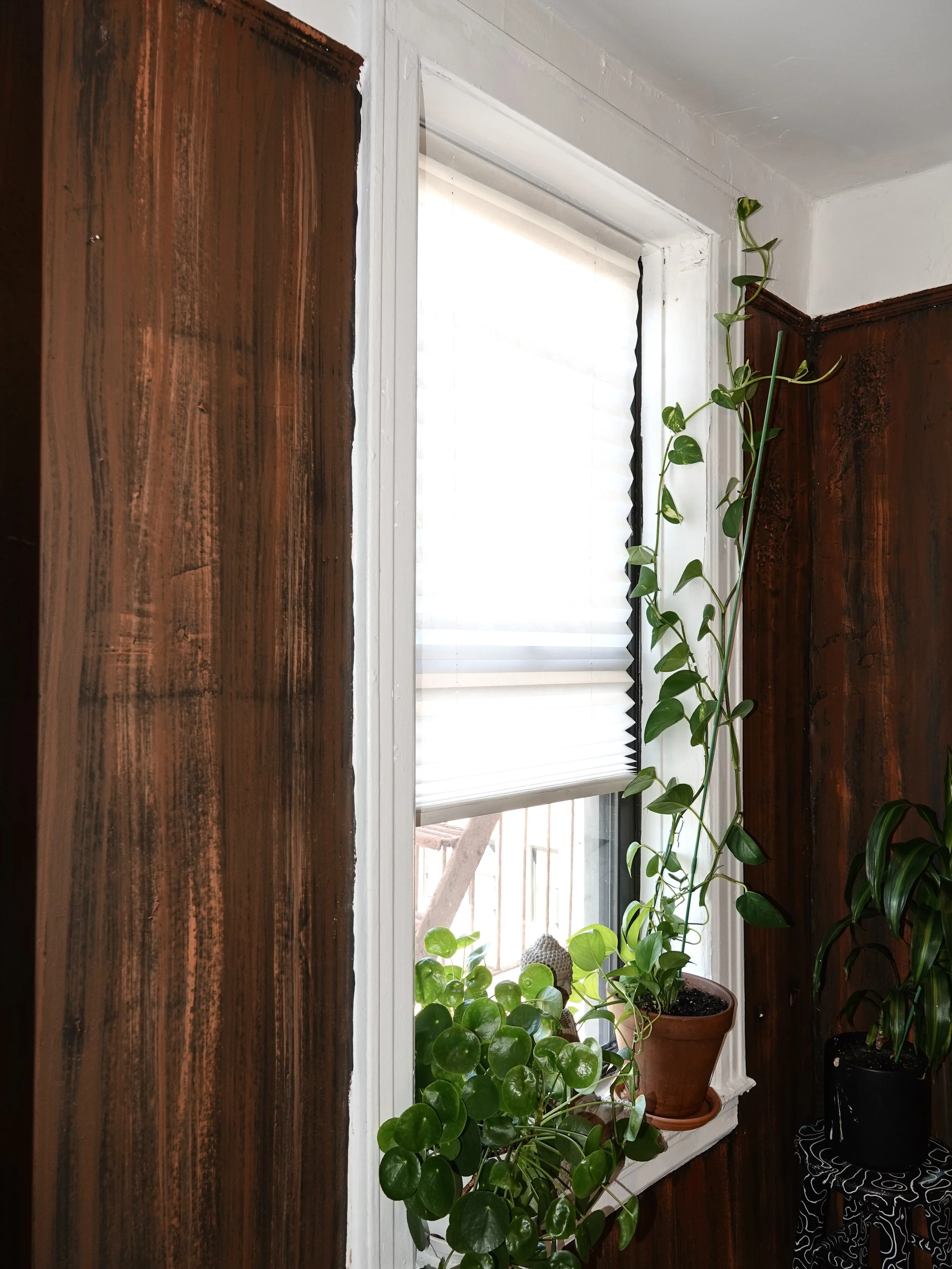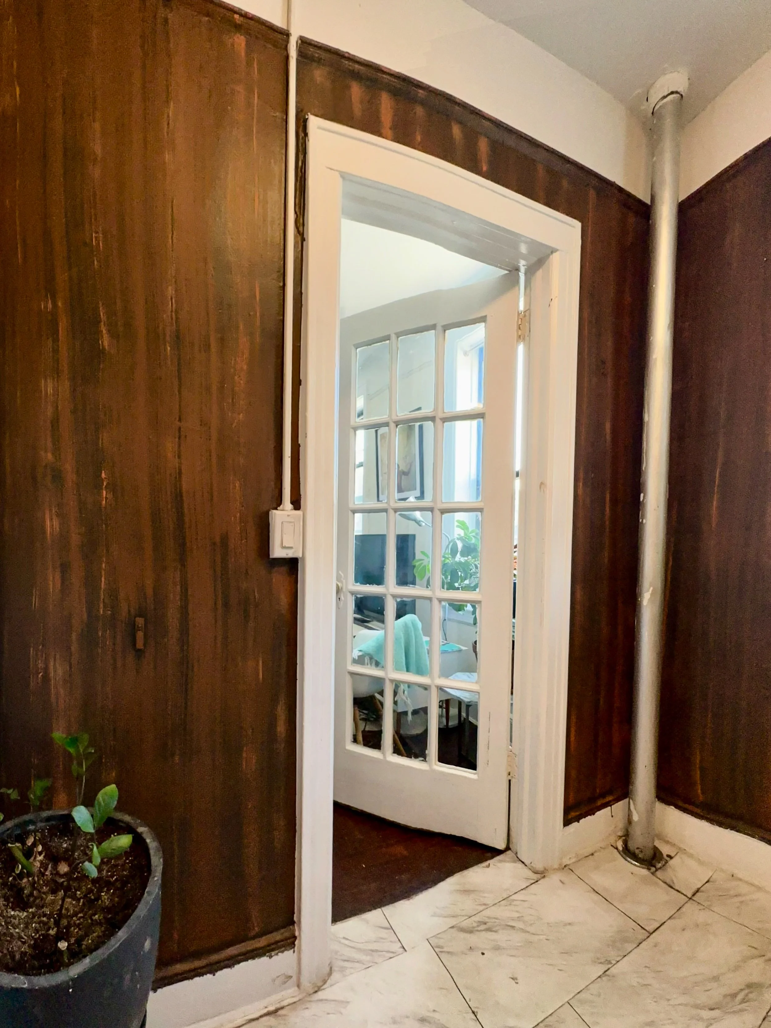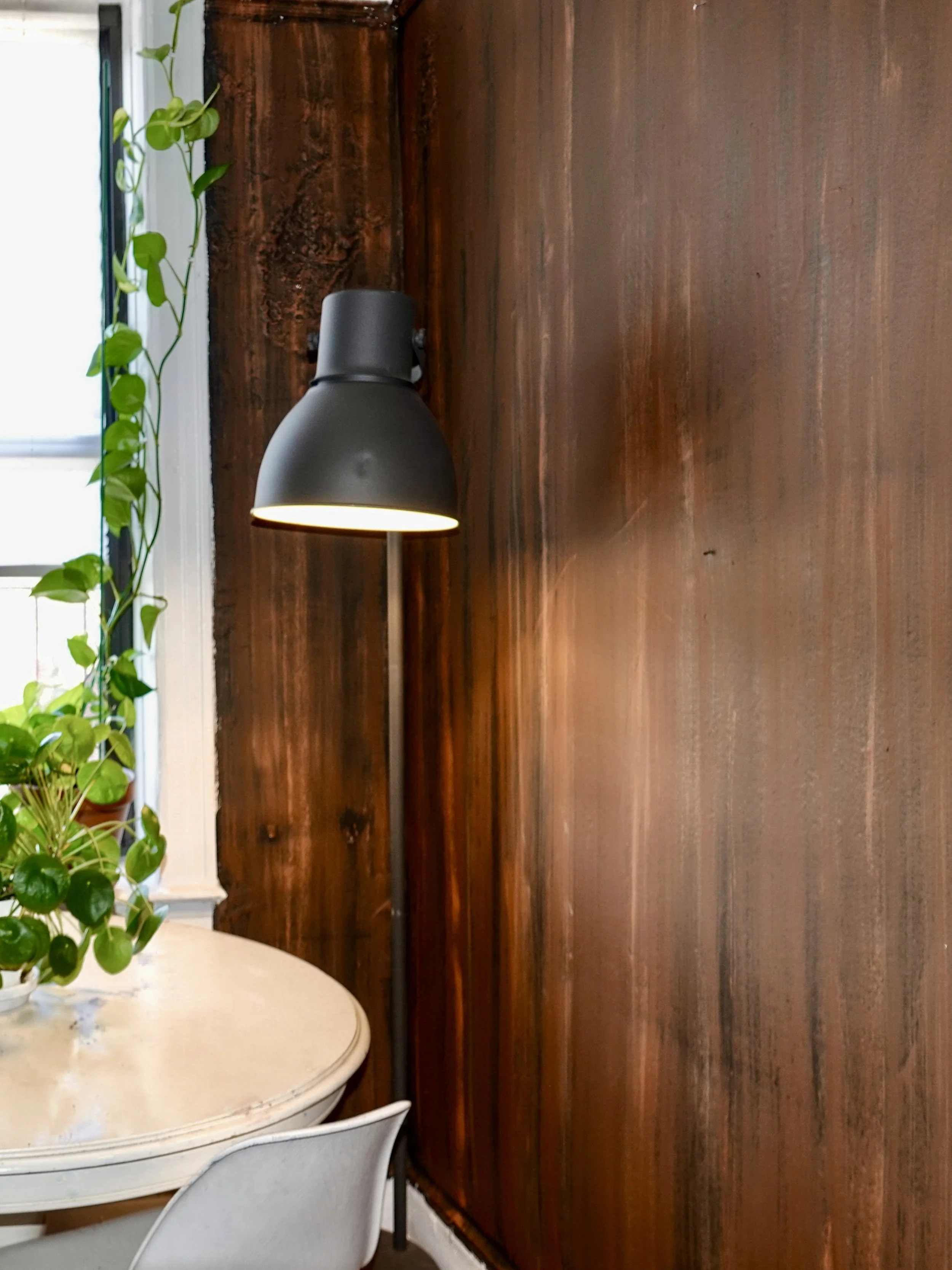 This kitchen transformation was all about warmth, character, and a touch of rustic sophistication. I recreated wood panel textures along the walls to elevate the space from a simple corner to a cozy, grounded retreat. The deep, rich tones of the faux wood finish instantly bring a sense of warmth and depth, while also creating the illusion of being somewhere far away—like a countryside cabin or an artist’s hideaway.