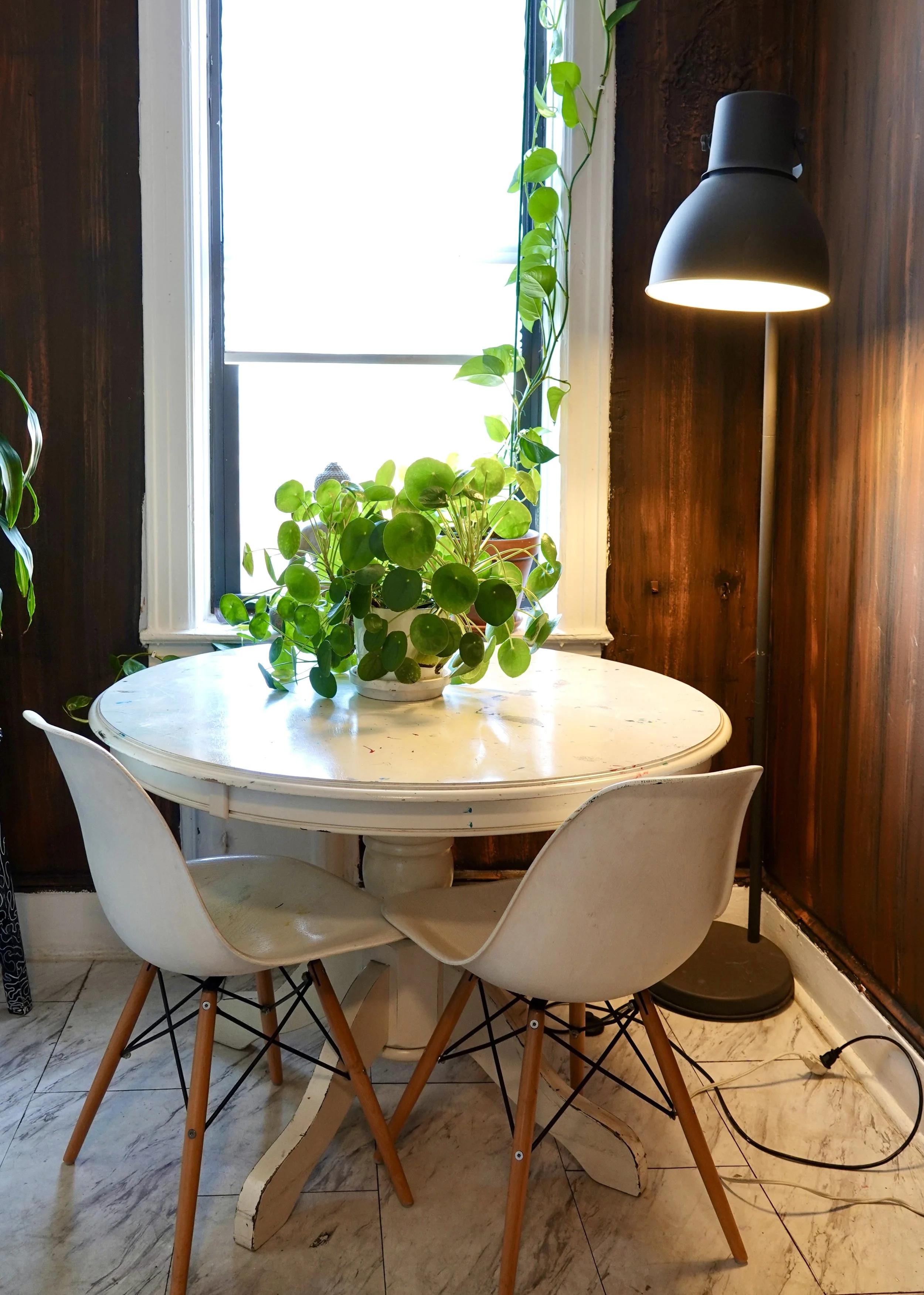 Natural elements like climbing plants and soft lighting were layered in to amplify the earthy atmosphere, blending rustic charm with a refined, elegant touch. The result is a kitchen nook that feels less like an apartment in the city and more like a personal escape—welcoming, grounded, and full of personality.